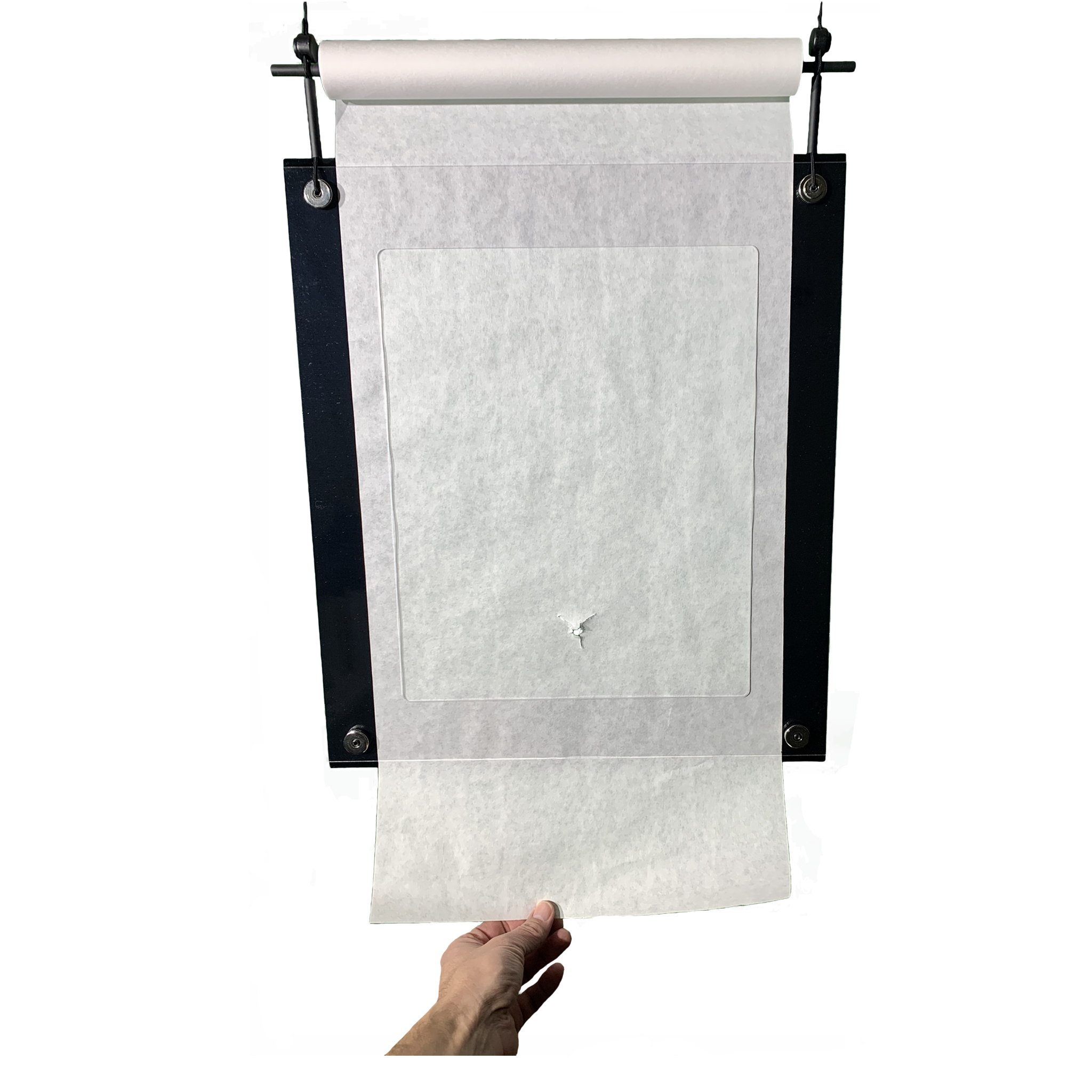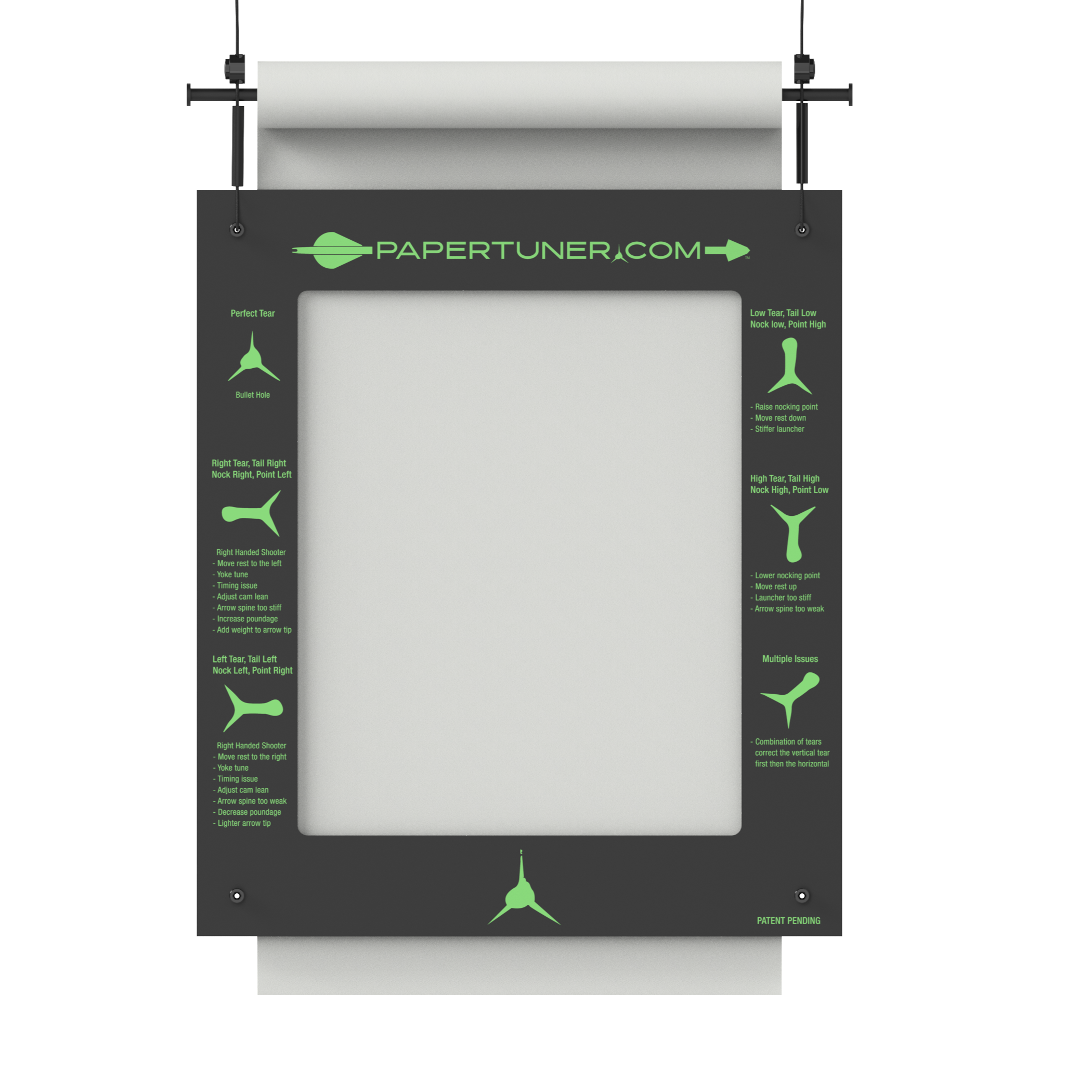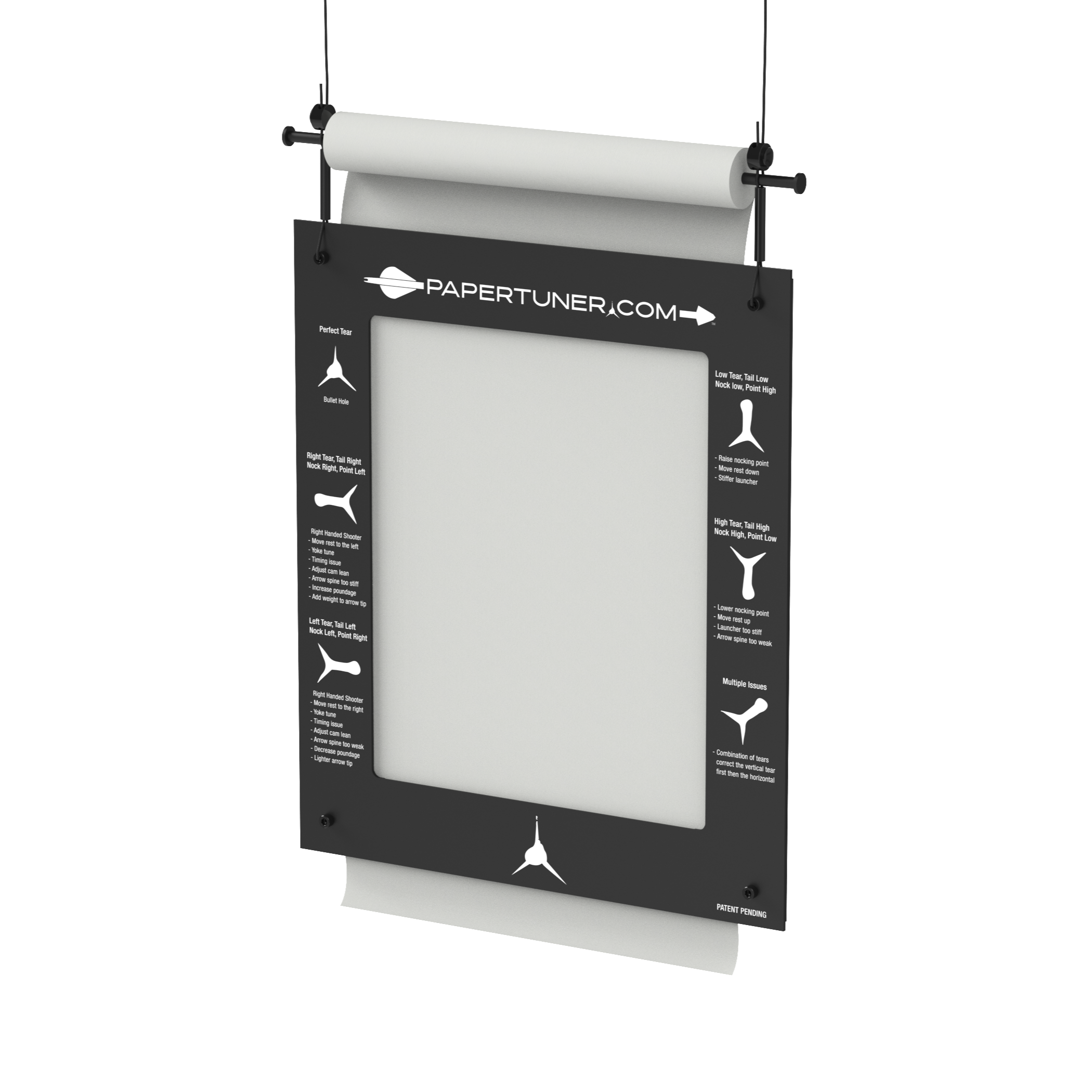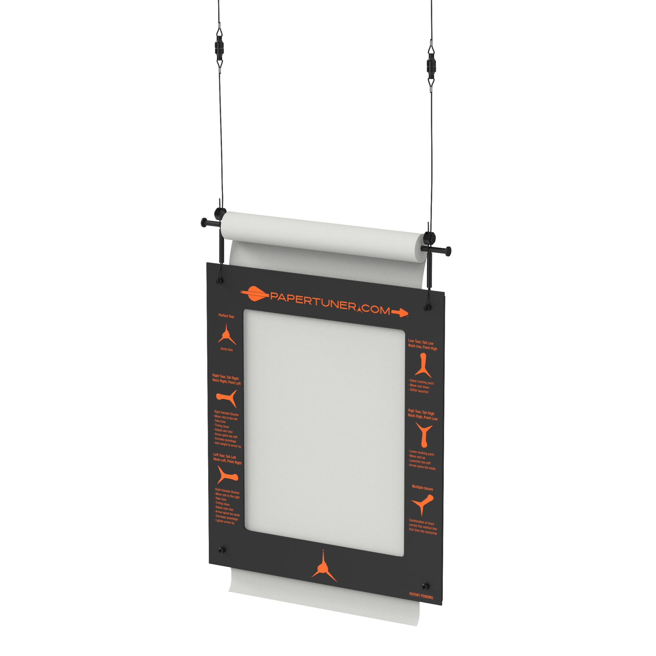 This game changing Archery Paper Tuner was designed from the ceiling down to help archers tune their compound bows. One of the key features of this device is it takes up zero floor space. The paper roll is above the tuner, and it's engineered so the paper can be easily pulled from the bottom as you tune your bow. It has magnetic quick disconnects so when you are done tuning your bow it's super easy to disconnect and store. No bulky equipment taking up your garage or shop floor.
